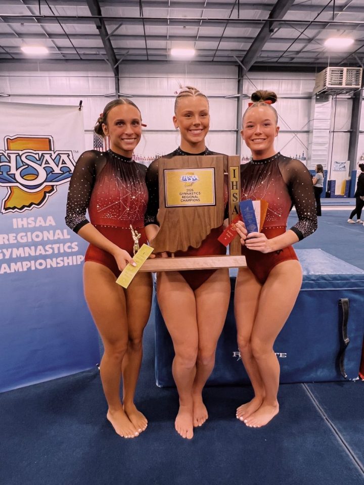 The New Palestine gymnastics team had a strong season filled with consistent performances and steady improvement. Starting their year off winning 6th in the state finals, the team showed discipline and focus in every meet, by winning sectionals and then winning the regional championship for the first time in school history. Athletes like senior Kalle Jones, and juniors Alexis Hall and Olivia Clark each contributed to the team’s success in different ways.